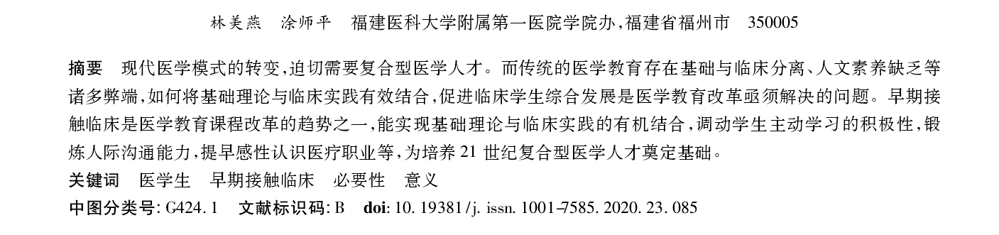 2.1.6有利于复合型医学人才的培养:21世纪是医学和生命科学的世纪,现代医学模式已经转变为生物一心理一社会的医学模式,培养高素质、高能力、应用性强、善于处理医患关系的复合型医学人才已成为新时代迫切的要求。新时代的医生不仅要具备扎实的理论知识和丰富的临床经验,还要有关心爱护患者、良好医患沟通等人文素养。开展早期接触临床,让低年级医学生进人医院,尽早接触医生和患者,体验诊疗过程,加强基础与临床医学的相互渗透,有利于初步培养学生的临床思维和医患沟通能力,同时,也将医疗质量与医疗安全、医疗保障体系、医改政策等卫生管理学、法学、伦理学的内容融人早期接触临床实践中,能及早对医学生进行职业行为、职业道德、人文素养等多种能力的培养。上述所培养的临床综合素质与能力,正是复合型医学人才所必须具备的。因此,开展早期接触临床,为培养具有高素质、应用型的复合医学人才奠定坚实的基础。